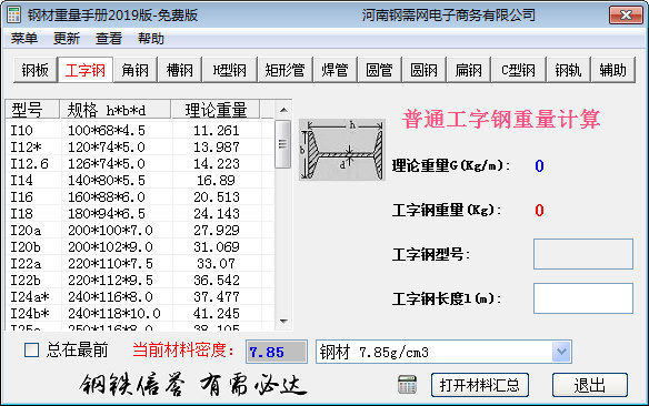 鋼材重量計算軟件,其中包含常用鋼板、工字鋼、角鋼、槽鋼、H型鋼、無縫管、鋼管、鋼軌、C型鋼理論重量的計算、磅差處理、金額大寫轉換等功能。