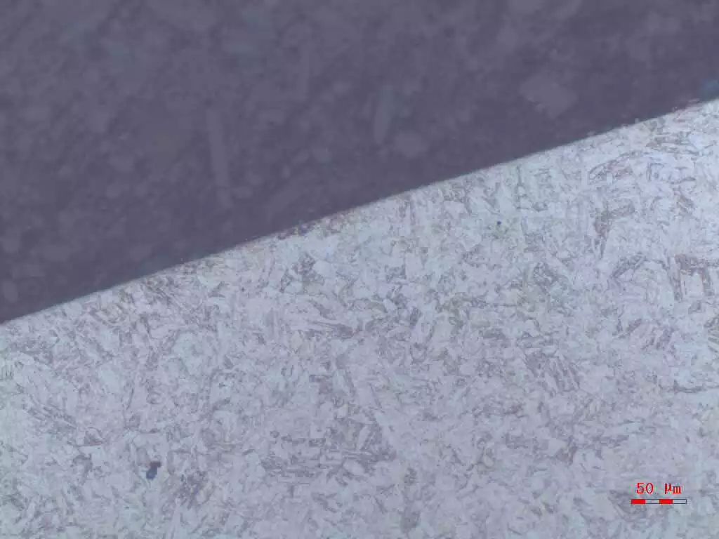 (1)0Cr17Ni4Cu4Nb棒材1040℃采用普通淬火油真空油淬時(shí),因其無(wú)法滿足真空專用淬火油(如KR328)極低的飽和蒸汽壓特性,淬火時(shí)在工件表面易形成油蒸汽外套,因發(fā)生熱裂解為活性碳原子,并隨即被工件吸收而產(chǎn)生滲碳作用的結(jié)果,表面產(chǎn)生0.04mm白亮層組織,且白亮層組織均勻一致,與基體組織沒(méi)有明顯的過(guò)渡區(qū)。