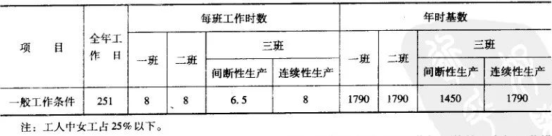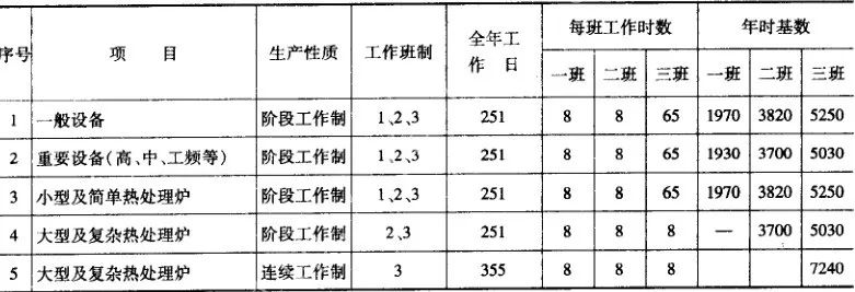 設備設計年時基數為設備在全年內的總工時數,等于在全年工作日內應工作的時數減去各種時間損失,見表2。