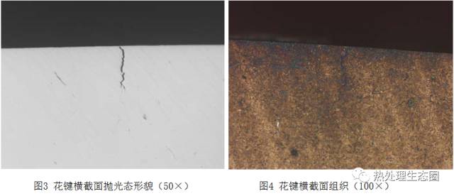 首先對齒軸進行宏觀形貌分析,對齒軸的磁痕部位進行線切割取樣,經打磨、拋光等金相制樣后,用顯微硬度計對滲層進行硬化層深度檢測,在金相顯微鏡上檢查其金相組織、非金屬夾雜物等。然后在齒軸心部取樣,在電感耦合等離子體發射光譜儀上進行化學成分分析。