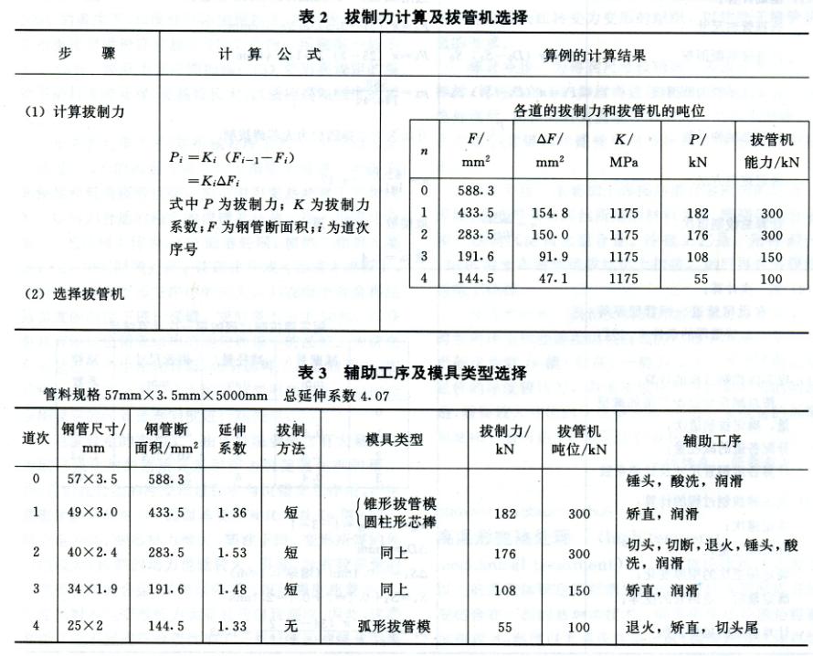 工藝程序表    表1為拔制25mmx2mm鍋爐管的拔制道次和各道變形量計算。表2為拔制力計算和拔管機選擇。表3為輔助工序和模具類型選擇。