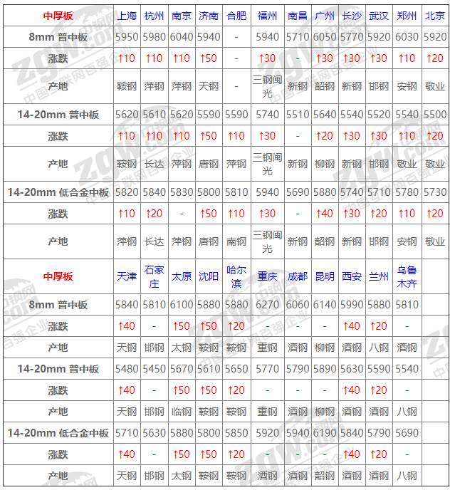 今全國中厚板價格上調為主,幅度10-50左右,終端入市顯謹慎,上午高位交投偏弱,期貨及鋼坯持續高位,商家心態較有支撐,預計短期偏強整理;